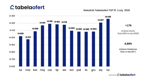 Z barometru cen mieszkań publikowanego co miesiąc przez portal mieszkaniowy Tabelaofert.pl wynika, że średnia cena metra kwadratowego nowych lokali liczona dla dziesięciu analizowanych miast (wskaźnik Tabelaofert TOP10) w lutym w porównaniu ze styczniem nieznacznie wzrosła – o 0,36 proc. do ponad 14,2 tys. zł za mkw. Można więc mówić o stabilizowaniu się rynku.
