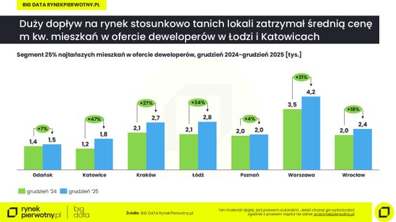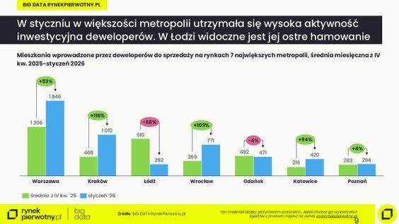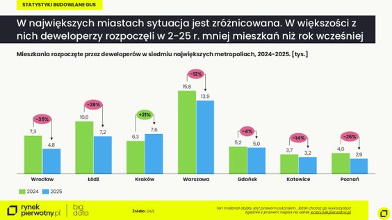 We Wrocławiu liczba mieszkań, których budowę rozpoczęto spadła aż o 35proc., w, Łodzi spadek sięgał 28 proc., w Warszawie – 12 proc., w Poznaniu – 26 proc., w Katowicach – 14 proc., a w Gdańsku – 4 proc. Inwestycyjne ożywienie GUS odnotował tylko w Krakowie, gdzie w 2025 r. deweloperzy rozpoczęli budowę o 21 proc. większej niż rok wcześniej liczby mieszkań.
