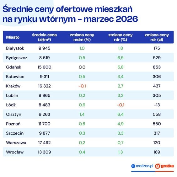 W marcu 2026 r. średnie ceny ofertowe mieszkań z drugiej ręki były o 0,5 proc. wyższe niż w lutym i o 3,6 proc. wyższe niż rok wcześniej. Największe wzrosty Grupa Morizon-Gratka odnotowała w Olsztynie, Bydgoszczy i w Gdańsku. Ceny są najbardziej stabilne w Warszawie i Łodzi.