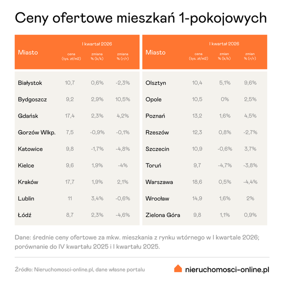 Jak wynika z danych Nieruchomosci-online.pl, w I kwartale roku średnia cena ofertowa kawalerek wzrosła w dziesięciu stolicach regionalnych. Ceny zmieniły się o 1-2 proc. kwartalnie: w Bydgoszczy (9,2 tys. zł za mkw.), Gdańsku (17,4 tys. zł), Kielcach (9,6 tys. zł), Krakowie (17,7 tys. zł), Łodzi (8,7 tys. zł), Poznaniu (13,2 tys. zł), Wrocławiu (14,9 tys. zł) i Zielonej Górze (9,8 tys. zł).