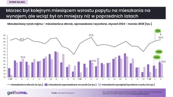 W efekcie na koniec marca w serwisach ogłoszeniowych było ok. 83,5 tys. unikatowych ofert najmu, o 2 proc. więcej niż miesiąc wcześniej, ale jednocześnie o 4 proc. mniej niż w analogicznym okresie ubiegłego roku, gdy dostępnych mieszkań było ponad 87 tys.