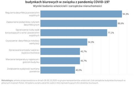 W znaczącej większości budynków wprowadzono nowe rozwiązania sanitarne, w tym regularne dezynfekcje powierzchni wspólnych (94 proc.). Zapewniono też specjalistyczne środki higieny osobistej (88 proc.).