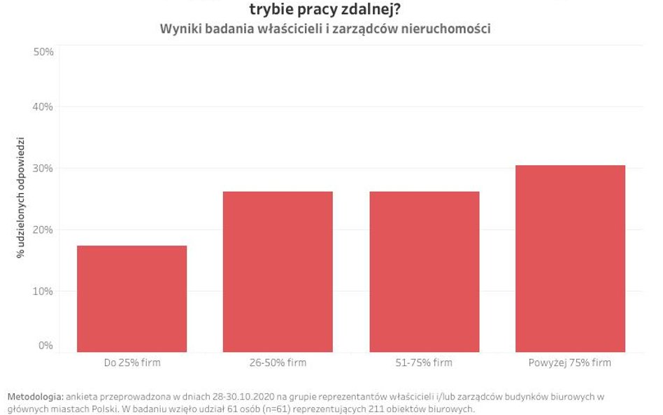Ok. 30 proc. respondentów oceniło, że w zarządzanych budynkach powyżej 75 proc. firm pracuje zdalnie.