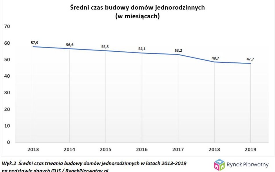 Jeżeli natomiast chodzi o przeciętny czas budowy domów jednorodzinnych, które wznoszą osoby prywatne, to widoczny jest długoletni trend. W 2019 roku było to prawie 48 miesięcy.