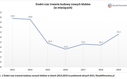 Wyniki z lat 2016 - 2018 wskazują na względną stabilizację przeciętnego czasu budowy bloków – w 2018 r. było to to ok. 22 miesięcy. Ubiegłoroczny wzrost analizowanego wskaźnika (23,3 miesiąca – patrz dołączony wykres) prawdopodobnie nie jest zapowiedzią dalszych dodatnich zmian.