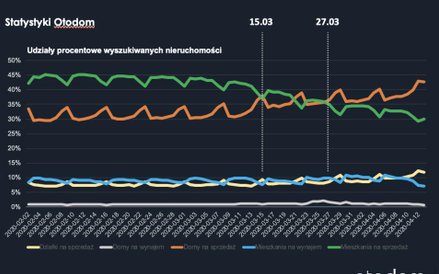 - Zamknięci od tygodni Polacy mają już dość przebywania w czterech ścianach. Dlatego, choć to mieszkania zwykle były najczęściej wyszukiwaną kategorią, od 27 marca najpopularniejsze są właśnie domy na sprzedaż - podsumowuje Jarosław Krawczyk. - Ilu użytkowników faktycznie zdecyduje się na zakup, a ilu na razie bada rynek, trudno powiedzieć. Wielu pośredników twierdzi, że ich telefony na razie milczą. Pocieszające jest to, że z przeprowadzonego przez nas badania wynika, że 80 proc. respondentów nie zamierza rezygnować z mieszkaniowych planów, ale jednocześnie 66 proc. twierdzi, że transakcja może się opóźnić. Można się więc spodziewać, że klienci chwycą za telefon lub napiszą e-mail, gdy sytuacja zacznie wracać do normy.