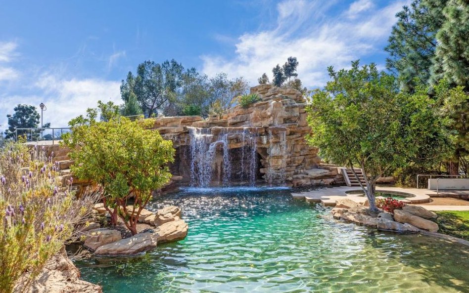 Wokół domu jest zadbany ogród z idealnie wypielęgnowanym trawnikiem w stylu angielskim, stawem z karpiami koi oraz rzeźbami, a także kort tenisowy i grota z wodospadem oraz basen. Jest też ogromny taras nad basenem.