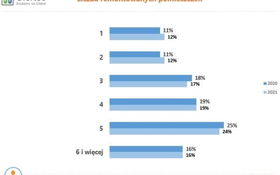 W tym roku fachowcy mają znacznie więcej pracy niż rok temu. - Jednocześnie zleceniodawcy niezmiennie preferują remonty kompleksowe, więc bardziej czasochłonne. Większość osób woli wygospodarować więcej czasu i funduszy na odświeżenie całego wnętrza, niż wprowadzać zmiany stopniowo – mówią autorzy raportu. - W tym roku prace remontowe najczęściej (25 proc. przypadków) obejmują pięć pomieszczeń. Co piąte pytanie dotyczy zlecenia na cztery pokoje, a 16 proc. zleceniodawców szuka ekipy do wyremontowania nawet sześciu pomieszczeń lub więcej.