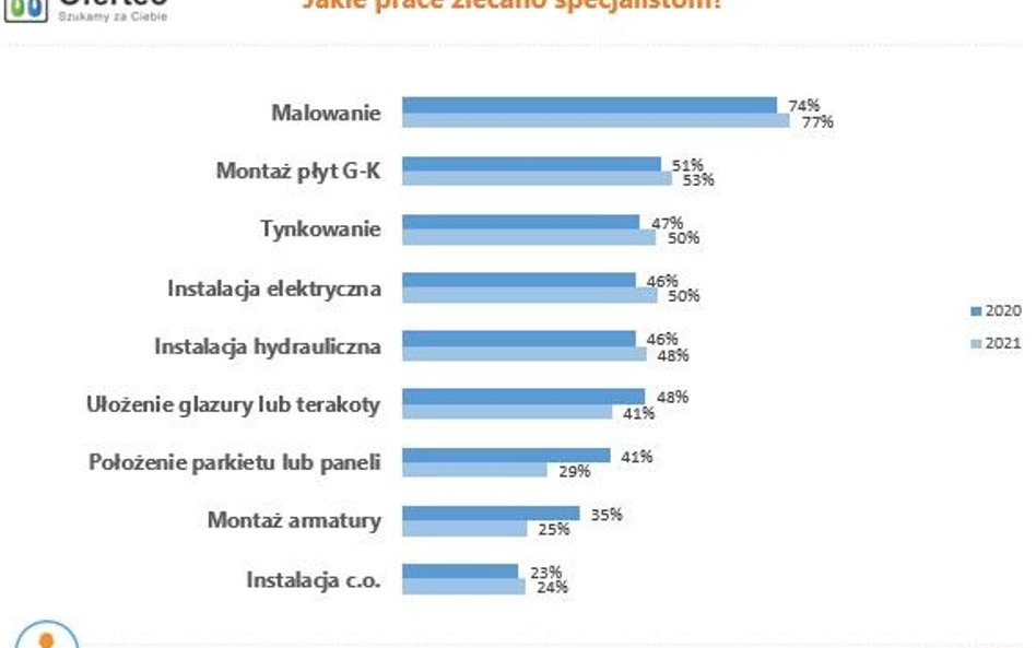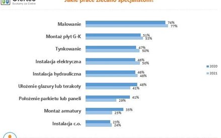 Od początku tego roku najwięcej zleceń (81 proc.) dotyczy pokoi dziennych lub sypialni. 70 proc. klientów postanowiło zmienić wygląd przedpokoju, 68 proc. – kuchni, a 67 proc. – łazienki. - Zapotrzebowanie na specjalistów od remontów jest duże, a zakres wykonywanych prac – szeroki. Do tej pory najczęściej poszukiwani byli malarze (77 proc. zapytań w 2021 roku), 53 proc. badanych zlecało montaż płyt gipsowo-kartonowych, a tynkowanie i wykonanie instalacji elektrycznej – po 50 proc. Najmniej pytań, zarówno w tym, jak i w ubiegłym roku dotyczyło instalacji c.o.