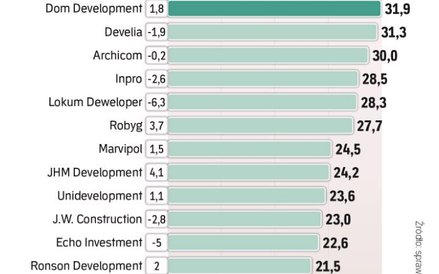 W skali całego roku tylko trzy spółki wypracowały rentowność z trójką z przodu: Dom Development (31,9 proc.), Develia (31,3 proc.) i Archicom (30 proc.). W 2019 r. takich spółek było pięć, a jeszcze rok wcześniej – cztery. Zmniejsza się także mediana: z 26,9 proc. w 2018 r. do 24,4 proc. w ubiegłym.