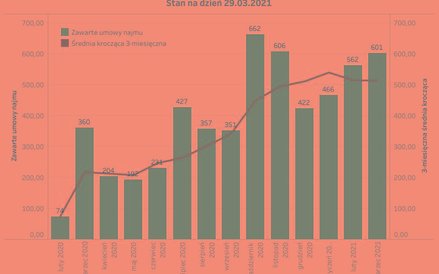 Marzec, jak dotąd, był na rynku biurowym najlepszym miesiącem w tym roku. Dla porównania, w lutym tego roku, podpisano 562 umowy najmu na 155 tys. mkw. biur. W styczniu umów było 466, w grudniu ubiegłego roku – 422. Rok temu w marcu zawarto 360 umów najmu biur.
