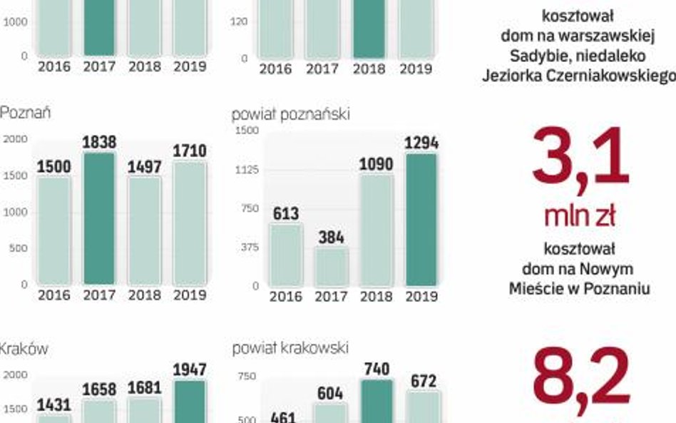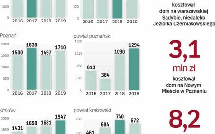 Trawiąca rynek nieruchomości gorączka – jak na razie – oszczędziła domy, choć i te drożeją. Nie tak jednak jak mieszkania. Analitycy Cenatorium wskazują, że na niektórych rynkach ceny lokali poszły w górę nawet o kilkanaście procent. Szybki wzrost cen mieszkań napędza rozwój rynku domów, co widać zarówno w liczbie transakcji, jak i wydawanych pozwoleń na budowę. Np. w Warszawie w 2016 r. sprzedano 2980 domów, w 2019 – 3810. W Poznaniu było to odpowiednio 1500 i 1710, a w Krakowie – 1431 i 1947.