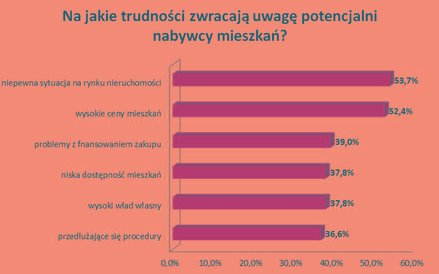 - Jeśli chcielibyśmy dokładniej przeanalizować trudności, z jakimi zmagają się klienci, najwięcej agentów Metrohouse (53,7 proc.) zwraca uwagę na podkreślaną przez nabywców niepewną sytuację na rynku nieruchomości, której nie jesteśmy w stanie odpowiednio prognozować w najbliższym czasie – mówi Marcin Jańczuk. - Równie wysoki wskaźnik odpowiedzi (52,4 proc.) uzyskała odpowiedź dotycząca przekonania kupujących o wysokich cenach mieszkań, które stanowią skuteczną barierę w dostępie do własnego lokum. Trzecie miejsce zajmują obiekcje klientów związane z finansowaniem zakupu (39 proc.) i wysokim wkładem własnym do kredytu (37,8 proc.).