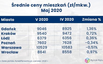 Odczyt cen ofertowych mkw. nowych mieszkań z danych bazy portalu RynekPierwotny.pl na koniec maja wskazuje na wyraźne hamowanie tendencji wzrostowej i przechodzenie rynku do stanu oczekiwanej stabilizacji. Co prawda w czterech z sześciu monitorowanych lokalizacji ceny wciąż rosły, jednak tylko w Gdańsku była to zmiana ponad 1-proc., natomiast w Krakowie, Łodzi i Wrocławiu o ułamek procenta.