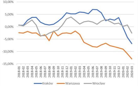 I dodaje, że najnowszy odczyt barometru nastrojów wyliczony został na bazie danych z marca, a efekty pandemii analizować będzie można z opóźnieniem. Stąd i wskaźnik, który porównuje cenowe oczekiwania potencjalnych nabywców na rynku pierwotnym (źródłem danych są deklaracje użytkowników obido.pl) ze średnimi cenami na rynku dla danej wielkości nieruchomości (dane ofertowe), nadal pokazuje, że mieszkania są droższe niż oczekiwaliby tego kupujący.