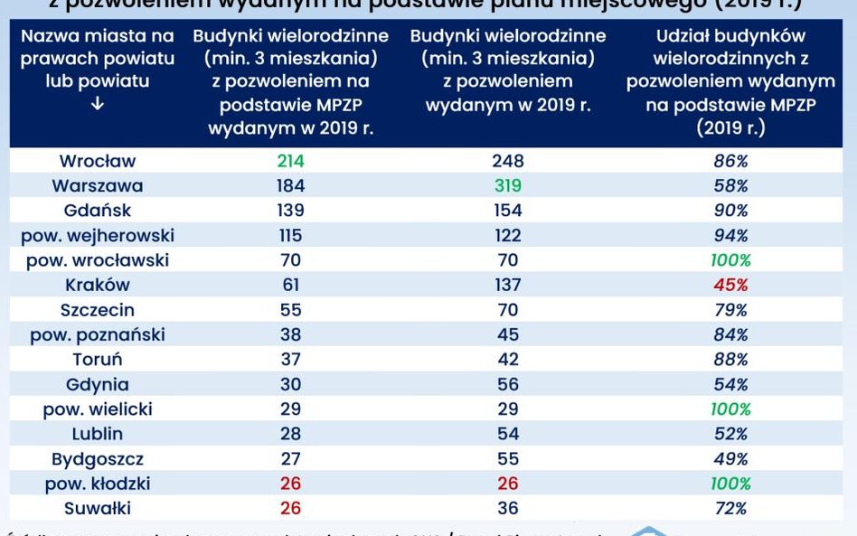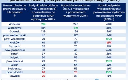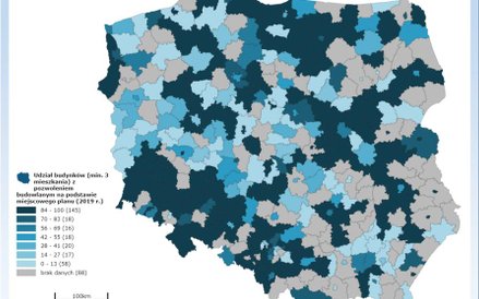 Główny Urząd Statystyczny niedawno opublikował dokładne dane o pozwoleniach na budowę domów i lokali. Od stycznia do grudnia 2019 r. zostały wydane pozwolenia na budowę 3497 budynków mieszkalnych z liczbą lokali wynoszącą co najmniej trzy. Aż 2313 takich budynków powstanie na postawie miejscowego planu. Można zatem powiedzieć, że dwie trzecie bloków z całej Polski powstaje na terenie objętym miejscowym planem zagospodarowania przestrzennego. W skali poszczególnych powiatów i miast na prawach powiatu, sytuacja okazuje się jednak bardzo zróżnicowana.