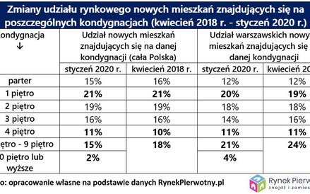 Dołączona tabela bazująca na danych z kwietnia 2018 roku i stycznia 2020 roku prezentuje porównanie udziału mieszkań pod względem ich usytuowania w budynku. Wyniki porównania pokazują, że przez niemal dwa lata udział mieszkań położonych najwyżej praktycznie się nie zmienił. Jeżeli chodzi o Warszawę, to odnotowano symboliczny wzrost udziału „M" usytuowanych na 5. piętrze lub wyższym (zmiana z 24 do 25 proc.). W skali całego kraju, odsetek wysoko położonych lokali od deweloperów nieznacznie spadł (z 18 do 17 proc.). Można było spodziewać się nieco innych zmian ze względu na szybki wzrost cen gruntów.