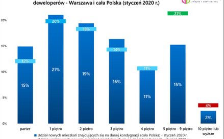 parter - 15 proc. mieszkań oferowanych w całym kraju/12 proc. mieszkań oferowanych w Warszawie 1 piętro - 21 proc. mieszkań oferowanych w całym kraju/20 proc. mieszkań oferowanych w Warszawie 2 piętro - 19 i 18 proc., odpowiednio 3 piętro - 16 i 14 4 piętro - 11 i 11 5 piętro - 9 piętro - 15 i 21 proc. 10 piętro lub wyższe - 2 i 4 proc.