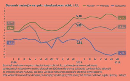 W niektórych dzielnicach średnie ceny za mkw. nowych lokali dawno przekroczyły 10 tys. zł. – W tym świetle nie dziwi fakt, że nasz barometr notuje w Warszawie ujemne wartości. Kupujący mieszkania nie akceptują wysokich cen. Przykładowo w segmencie mieszkań dwupokojowych średnia cena wzrosła w ostatnich 12 miesiącach o ponad 15 proc., w tym samym czasie kwota deklarowana przez szukających nieruchomości zwiększyła się o niespełna 12 proc. – wskazuje Marcin Krasoń z Obido.