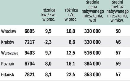 W stolicy za mkw. mieszkania płacimy średnio 9,4 tys. zł, o 12,5 proc. więcej niż rok temu. W Gdańsku ceny w ciągu roku poszły w górę o 22,4 proc., do 7,8 tys. zł za mkw., we Wrocławiu o 16,8 proc., do niemal 6,9 tys. zł, a w Łodzi o 15,2 proc., do ponad 4,7 tys. zł za mkw.