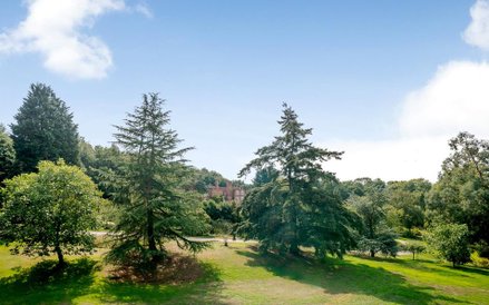 W ogrodzie jest starannie wypielęgnowany trawnik, basen, kort tenisowy, dwa stawy oraz ogród skalny, a także sad i pomieszczenia gospodarcze. Cała posiadłość ma powierzchnię ponad 7 hektarów i poza terenem wokół domu jej powierzchnię stanowi las mieszany iglasto-liściasty.
