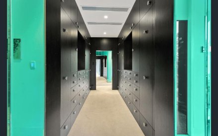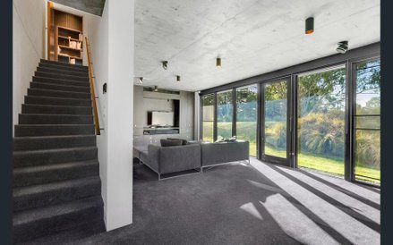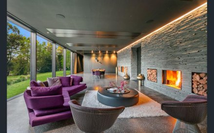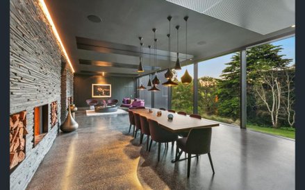 To luksusowy, parterowy dom z pięcioma sypialniami, ogromny, przeszklonym salonem z dwoma kominkami, nowoczesna kuchnią z częścią jadalną oraz zapleczem kuchennym - w tym drugą kuchnią i spiżarnią - oraz pokojem telewizyjnym i biblioteką. Do tego jest garaż na dwa samochody oraz zaplecze gospodarcze z dużą pralnią i suszarnią. W piwnicy jest specjalne pomieszczenie do przechowywania wina.