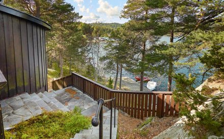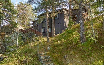 Budynek ma podpiwniczenie, które jest też miejscem mieszkalnym. W sumie w domu są cztery sypialnie, ogromny salon, kuchnia, jadalnia, łazienka i toaleta. Dzięki drzewom budynek jest nieco schowany i zapewnia prywatność mieszkańcom. A z tarasów zbudowanych po dwóch stronach wody można podziwiać widok na fiord i okoliczne wyspy oraz stały ląd.