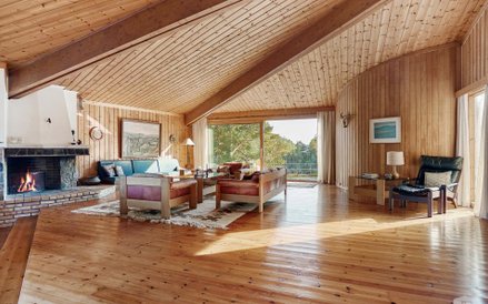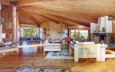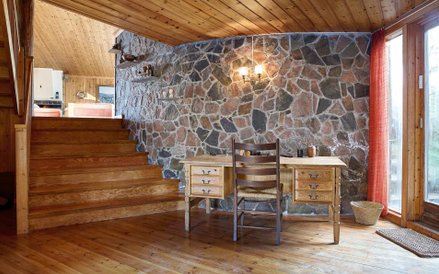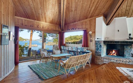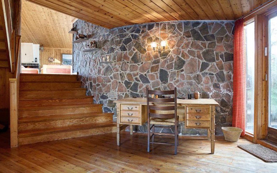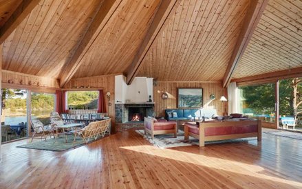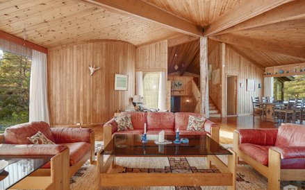 Dom znajdujący się na wyspie jest zbudowany głównie z drewna i ma kształt namiotu. W zasadzie nie ma ścian działowych, a centralnym miejscem jest duży salon z kominkiem.