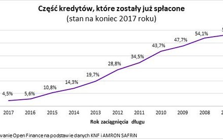 Z danych KNF i AMRON - SARFiN wynika, że na koniec 2017 roku do spłacenia wciąż pozostało prawie 90 proc. złotowych kredytów mieszkaniowych zaciągniętych w 2015 roku, ale już z długów zaciąganych w 2010 spłaconych zostało 44 proc. - Dostępne dane sugerują wyraźny trend do przedterminowych spłat zaciąganych kredytów hipotecznych. Gdyby spróbować go ekstrapolować, to okazałoby się, że tylko około 7 proc. osób, które zadłużyły się na przynajmniej 35 lat, nie spłaci swojego długu przed czasem - zauważa Bartosz Turek. - To oznacza, że przeciętny dług spłacony zostanie w ciągu niecałych 13 lat. Wynik niezły biorąc pod uwagę, że obecnie Polacy zadłużają się przeciętnie na 26 lat.