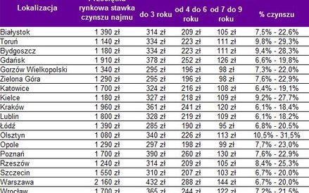 - Spójrzmy na konkretny przykład. Załóżmy, że co miesiąc oszczędzamy po 500 złotych, a oprocentowanie z dopłatą wynosi 5 proc. i nie podlega ono opodatkowaniu. Po pięciu latach otrzymujemy solidną kwotę prawie 35 tys. zł, którą wydać można na własne potrzeby mieszkaniowe, a łączny koszt wsparcia tego celu przez budżet państwa wyniósłby w tym wypadku niecałe 2,5 tys. zł - opowiada Bartosz Turek. - Wróćmy jednak do projektu ustawy o dopłatach do czynszów. Wynika z niego, że najemcy będą mogli liczyć na dofinansowanie przez dziewięć lat. Okres ten będzie podzielony na trzy równe części. Najwyższe dopłaty otrzyma się na początku, po trzech latach zmaleje one o jedną trzecią, a w ostatnim okresie o kolejne 50 proc. Kwota dopłaty będzie zależna od liczby osób w gospodarstwie domowym oraz informacji na temat kosztu budowy nowego lokum w danej lokalizacji. Przykład? Gdyby ustawa dziś działała, to w Warszawie, jak szacuje Bartosz Turek, singiel mógłby co miesiąc liczyć na dopłatę w kwocie 173 złotych przez pierwsze trzy lata. Potem miałaby ona stopnieć do 115 zł, aby przez ostatnie trzy lata wynieść 58 złotych miesięcznie.