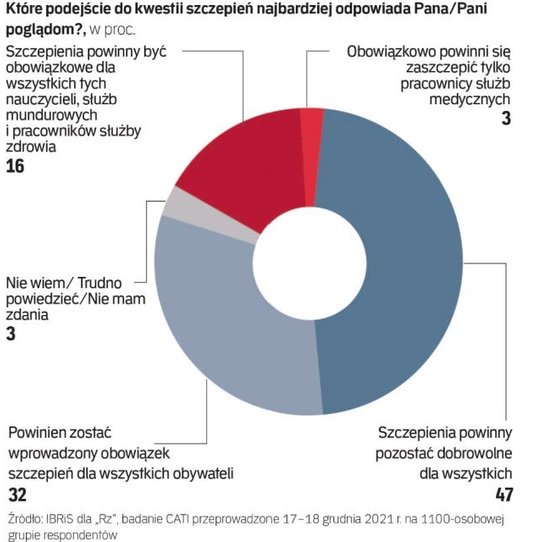 Mimo dramatycznie wysokiej liczny zgonów w Polsce z powodu Covid-19 nadal blisko połowa Polaków jest za dobrowolnością w kwestii szczepień (46,7 proc.) – wynika z sondażu IBRiS dla „Rzeczpospolitej". Z drugiej strony za takim obowiązkiem jest co trzeci ankietowany ( 31,6 proc.) – a przychylność wobec tego pomysłu rośnie z wiekiem – w grupie od 60 lat w górę „za" jest między 43 a 49 proc. osób.