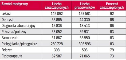 Niezaszczepionych dwiema dawkami ma być też ok. 12 proc. dentystów (5,3 tys. osób), 14 proc. diagnostów laboratoryjnych (2,5 tys. osób), po 17 proc. położonych (6,7 tys. osób) i farmaceutów (6,5 tys. osób) oraz 27 proc. fizjoterapeutów (12,2 tys. osób).
