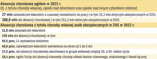 Wzrosła też ogólna liczba zaświadczeń lekarskich. W całym kraju wystawiono ich 27 mln na łącznie 288,8 mln dni absencji.