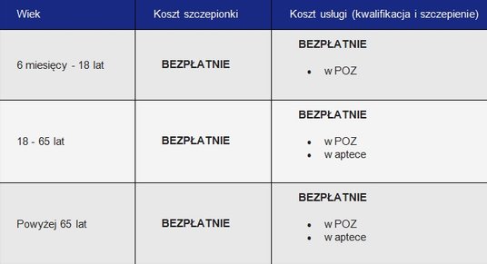 Jak przypomina NFZ, zgodnie z obwieszczeniem Ministra Zdrowia z października 2023 r. zalecane szczepienia ochronne w aptece dotyczą: grypy (od 1 listopada 2023 r.), pneumokoków (od 1 listopada 2023 r.), COVID-19 (od 1 grudnia 2023 r.). Szczepienia w tym zakresie można wykonać także w przychodni Podstawowej Opieki Zdrowotnej. W obu przypadkach placówki te muszą mieć umowę z NFZ na wykonywanie szczepień.