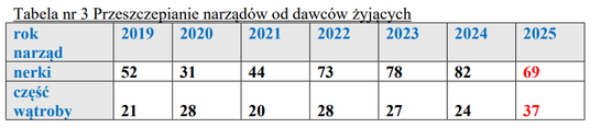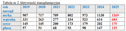 W 2025 r. wykonano 2298 przeszczepień od dawców zmarłych oraz 106 przeszczepień od dawców żyjących. Najczęściej przeszczepianym narządem pozostaje nerka. W ubiegłym roku wykonano 1269 przeszczepień tego narządu, czyli o 80 proc. więcej niż w 2021 r. Porównując z 2020 r., liczba przeszczepień wątroby wzrosła o 160 proc., a liczba przeszczepień płuc o 45 proc.