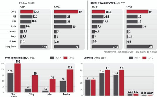 Jakie główne zmiany zajdą do roku 2050? Okazuje się, że waga Chin wzrośnie już tylko nieznacznie, do niemal 1/5 gospodarki światowej, natomiast Indii wzrośnie znacznie, z obecnego umiarkowanego poziomu blisko 1/14 do 1/7 gospodarki światowej. Znaczenie UE oraz USA spadnie mocno, każde do około jednej dziesiątej gospodarki światowej. W roku 2017 PKB Starego świata przewyższał o niemal połowę PKB Nowego. W 2050 to PKB Nowego będzie przewyższać o niemal połowę PKB Starego. Głównym powodem tych zmian będzie masowy transfer technologii ze Starego Świata, w sytuacji gdy liczba mieszkańców nowego pozostanie około trzykrotnie wyższa.