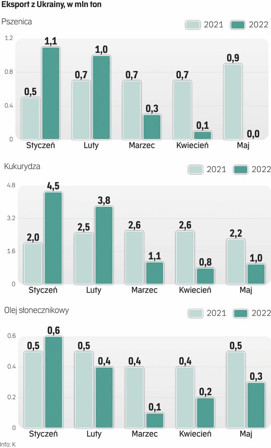 Ukraina nie jest w stanie dostarczyć wszystkich dostępnych zapasów zboża na rynki zewnętrzne z powodu rosyjskiej blokady Morza Czarnego. Blisko 5 mln t pszenicy i 10 mln t kukurydzy ze zbiorów z 2021 roku pozostanie w elewatorach zbożowych, nie wspominając nawet o zbiorach z 2022 roku. Alternatywne możliwości przeładunkowe mogą zostać rozwinięte w perspektywie średnioterminowej (trzy–pięć lat), na krótką metę nie ma innego rozwiązania niż odblokowanie ukraińskich portów morskich.