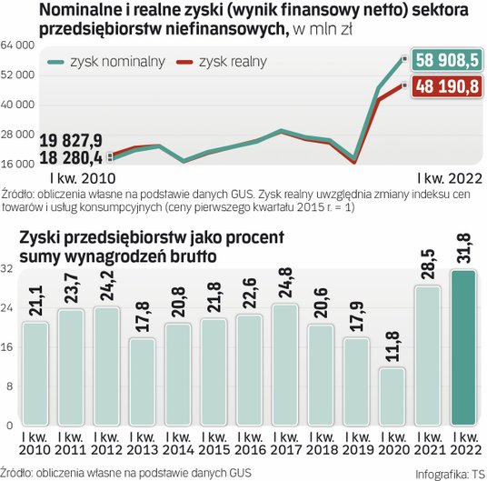Jak widać, po kryzysowym (także dla przedsiębiorstw) pierwszym kwartale 2020 r. zyski „wystrzeliły” w latach 2021 i 2022. Już w I kwartale 2021 r. były one większe od sumy zysków osiągniętych w I kwartale 2020 r. oraz I kwartale 2019 r.! Dalszy znaczny postęp odnotowano w I kwartale 2022 r.