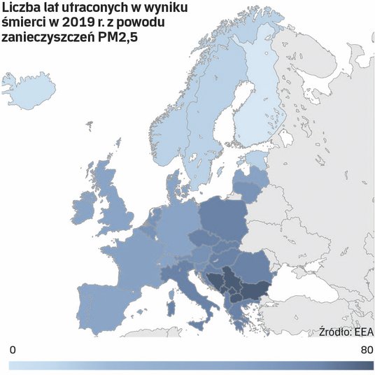 Analizy EEA przypisały w 2019 r. 307 tys. przedwczesnych zgonów na Starym Kontynencie chronicznemu narażeniu na drobne cząstki stałe (zwłaszcza PM 2,5), 40,4 tys. zgonów – przewlekłej ekspozycji na dwutlenek azotu, a 16,8 tys. – ekspozycji na ozon.