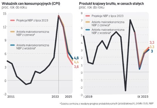 Na to, jak w ostatnim czasie zmieniły się prognozy inflacji, wskazują m.in. wyniki ankiety makroekonomicznej NBP wśród tzw. profesjonalnych prognostów. Uczestnicy wrześniowej edycji przeciętnie oceniają, że w 2023 r. inflacja z 50-proc. prawdopodobieństwem znajdzie się w przedziale 11,5–12,3 proc., w 2024 r. w przedziale 4,8–8,1 proc., a w 2025 r. w przedziale 3,1–6,7 proc. Tzw. ścieżka centralna (wyznaczona przez środek przedziałów) tych prognoz wskazuje na inflację w br. na poziomie 11,9 proc., a następnie – odpowiednio – 6,3 i 4,8 proc. W porównaniu z ankietą z czerwca prognozy na ten i przyszły rok nieco zmalały, ale na 2025 r. wzrosły.