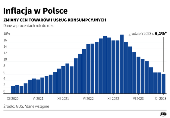 Wskaźnik cen konsumpcyjnych, główna miara inflacji w Polsce, wzrósł w grudniu o 6,1 proc. rok do...