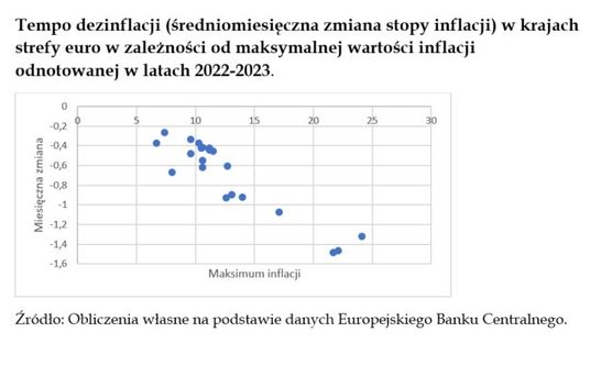 Tempo dezinflacji (średniomiesięczna zmiana stopy inflacji) w krajach strefy euro w zależności od maksymalnej wartości inflacji odnotowanej w latach 2022-2023.