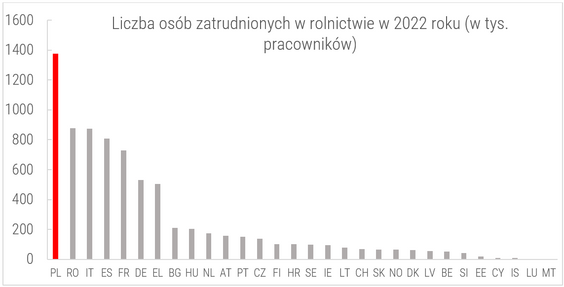 W 2022 r. w polskim rolnictwie pracowało prawie 1,4 mln osób (czerwony słupek na wykresie). W żadnym innym kraju Unii Europejskiej ta liczba nie była tak wysoka. W Rumuni i Włoszech, czyli w kolejnych krajach o największej liczbie zatrudnionych w rolnictwie, to tylko ok. 870 tys.