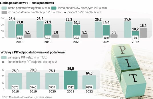 Jedną z najciekawszych informacji zawartych w tych podsumowaniach są dane o liczbie podatników wykazujących podatek należny. Dowiadujemy się z nich, ilu podatników rzeczywiście płaci PIT. Podatek należny to nic innego jak podatek, który należy wpłacić na rachunek urzędu skarbowego. I to właśnie na podstawie tych danych można śmiało powiedzieć, że od 2022 r. PIT definitywnie przestał być podatkiem powszechnym.