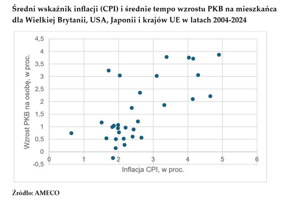 Ogląd danych statystycznych dla krajów Unii Europejskiej (ale także Wielkiej Brytanii, USA i Japonii) zdaje się przeczyć twierdzeniu o koniecznie dobroczynnych (dla wzrostu gospodarczego) skutkach trwale niskiej inflacji. Okazuje się, że inflacja (CPI) średnia dla dłuższego okresu (2004–2024) koreluje się pozytywnie ze średnim (w tym okresie) tempem wzrostu PKB na jednego mieszkańca. Czym wyższa inflacja, tym – generalnie – szybszy wzrost gospodarczy. Fakt ten ilustruje wykres.