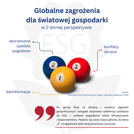 Po agresji Rosji na Ukrainę i wzroście zagrożeń geopolitycznych nastąpiła stopniowa redefinicja podejścia do ESG, z próbami pogodzenia celów klimatycznych i bezpieczeństwa. Pojawia się coraz więcej głosów, by litera „S”, która pierwotnie odnosiła się do aspektów społecznych, takich jak: prawa człowieka, warunki pracy, równość płci, relacje z lokalnymi społecznościami, etc, uwzględniała także bezpieczeństwo (security). Coraz częściej postulowane jest formalne uznanie bezpieczeństwa za warunek konieczny funkcjonowania społeczeństwa i traktowanie inwestycji w obronność jako elementu ochrony wartości społecznych i praw człowieka.