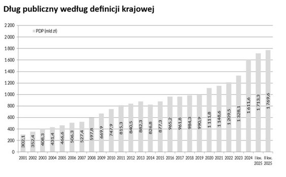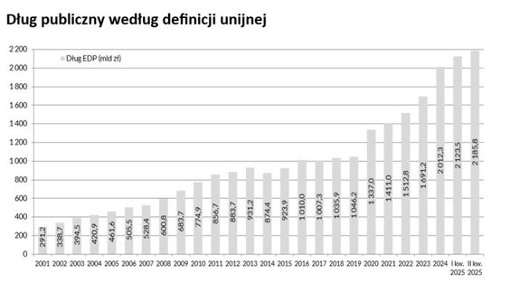 Dług publiczny według definicji unijnej (EDP) wyniósł już 58,2 proc. PKB. W I połowie roku wzrósł o 2,9 pkt proc. i na koniec czerwca wyniósł ponad 2,18 bln zł. Ta metodologia, a nie polska używana w ustawie o finansach publicznych i w Konstytucji, decyduje o uruchomieniu procedury nadmiernego deficytu.