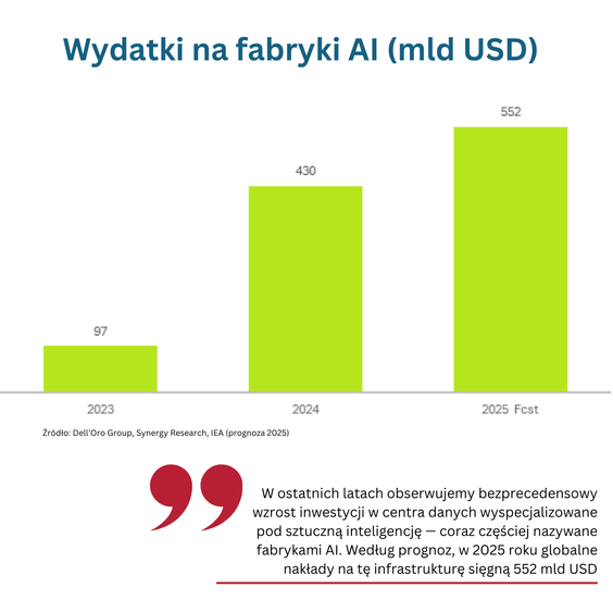 W ostatnich latach obserwujemy bezprecedensowy wzrost inwestycji w centra danych wyspecjalizowane pod sztuczną inteligencję – coraz częściej nazywane fabrykami AI. Według prognoz, w 2025 r. globalne nakłady na tę infrastrukturę sięgną 552 mld dol. (źródło: Dell’Oro Group, Synergy Research, IEA). To już nie są kameralne laboratoria z kilkoma serwerami, w których zespoły inżynierów w odosobnieniu trenują algorytmy. Dzisiejsze fabryki AI to wysoce zaawansowane centra obliczeniowe, operujące na dziesiątkach tysięcy najnowszych układów scalonych, realizujących miliardy operacji w każdej sekundzie. W takim środowisku każdy megawat energii staje się strategicznym zasobem – decydującym zarówno o możliwościach obliczeniowych, jak i o tempie rozwoju cyfrowej inteligencji. W epoce, w której dane stają się surowcem, a moc obliczeniowa nową walutą przewagi konkurencyjnej, infrastruktura AI zaczyna kształtować architekturę przyszłej gospodarki oraz nowy układ globalnych wpływów.