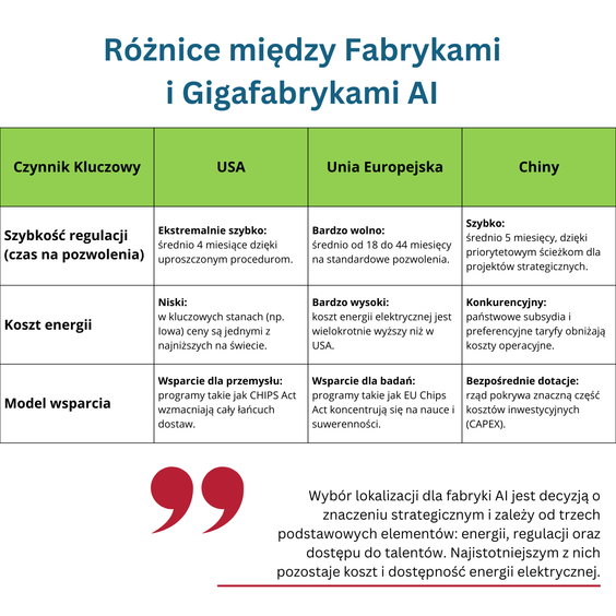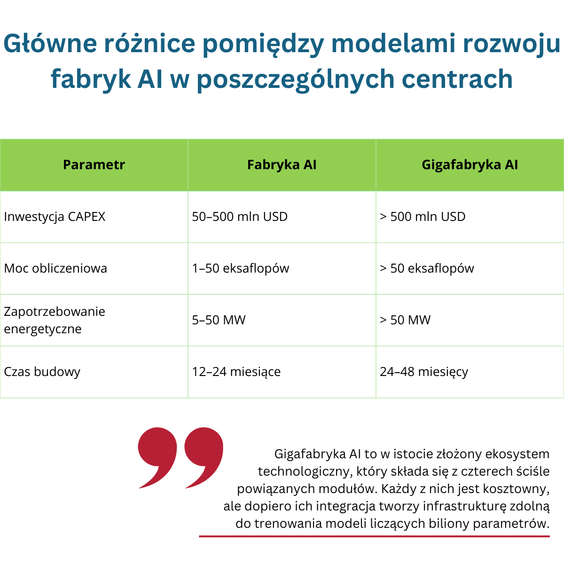 Infrastruktura sztucznej inteligencji rozwija się dziś w dwóch głównych formatach, które różnią się skalą, mocą obliczeniową i przeznaczeniem. Fabryka AI to wyspecjalizowane centrum danych zaprojektowane z myślą o trenowaniu modeli sztucznej inteligencji, prowadzeniu badań i rozwoju oraz świadczeniu usług chmurowych opartych na AI. Takie obiekty działają zwykle na poziomie regionalnym lub korporacyjnym, zapewniając lokalną bazę mocy obliczeniowej dla firm i instytucji. Natomiast gigafabryki AI reprezentują infrastrukturę działającą w znacznie większej skali. To one umożliwiają trenowanie największych modeli językowych świata, liczących często ponad 100 mld parametrów oraz obsługę milionów zapytań użytkowników w skali globalnej. Gigafabryki definiują dziś granice technologicznych możliwości w obszarze generatywnej sztucznej inteligencji i zaawansowanej automatyzacji. To nie tylko inna skala technologiczna, lecz także inny próg wejścia, inne ryzyka, inna rola w gospodarce i coraz częściej inne znaczenie geopolityczne.
