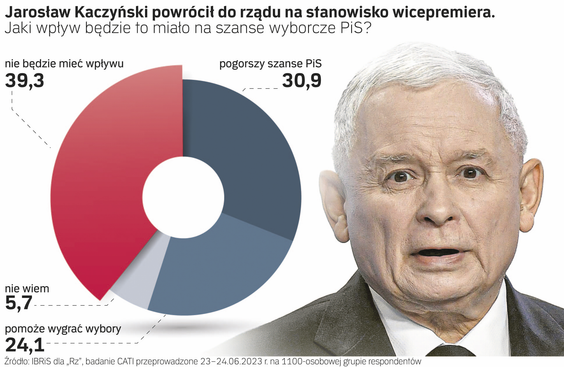 Sondaż IBRiS dotyczący powrotu do rządu lidera PiS, nie przynosi Jarosławowi Kaczyńskiemu dobrych wiadomości. 24 proc. badanych uważa, że ten ruch pomoże wygrać wybory partii rządzącej, a 30,9, że obniży to szanse PiS. Najgorsza jest jednak trzecia opcja: 39,3 proc. badanych, czyli największa grupa, uważa, że powrót prezesa do rządu nic nie zmieni. A spora część tych respondentów to wyborcy obozu władzy.